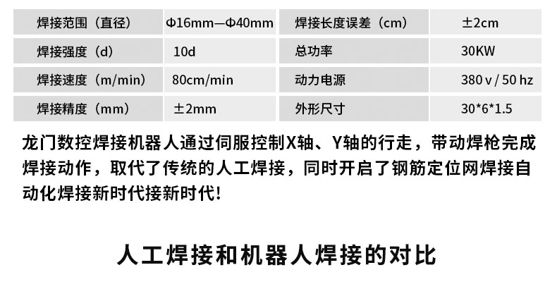 隨著我國(guó)經(jīng)濟(jì)的迅速發(fā)展,生產(chǎn)周期在不斷地縮短,焊接自動(dòng)化、焊接質(zhì)量要求不斷地提高,使得數(shù)控鋼筋加工裝備替代傳統(tǒng)手工加工及半自動(dòng)機(jī)械加工鋼筋成為必然趨勢(shì)。到目前為止,國(guó)內(nèi)蓋梁骨架片焊接工作90%以上都是由人工焊接完成。存在效率低下,質(zhì)量不可控,工人勞動(dòng)強(qiáng)度高與身體傷害嚴(yán)重。公司在這樣的市場(chǎng)環(huán)境下研發(fā)出國(guó)內(nèi)一臺(tái)龍門式蓋梁骨架片焊接機(jī)器人,同時(shí)開啟了蓋梁鋼筋骨架片自動(dòng)化焊接新時(shí)代!